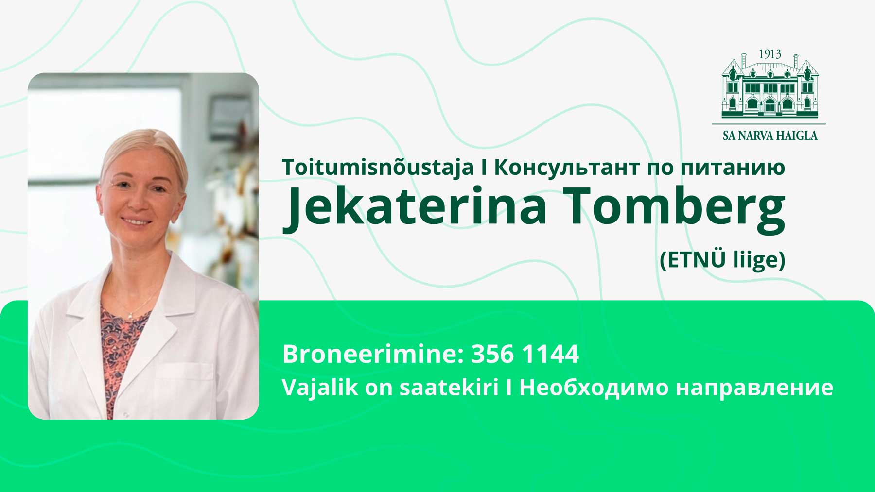 Консультации проводит Екатерина Томберг — консультант по питанию, член Эстонского союза консультантов и терапевтов по питанию (ETNÜ). На приёме специалист помогает оценить текущие привычки питания, обсудить режим дня и уровень физической активности, а также определить, какие изменения могут поддержать здоровье и помочь чувствовать себя стабильнее и энергичнее в повседневной жизни.